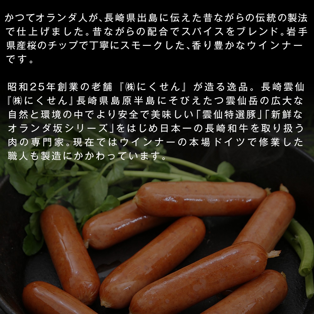 ボリューム満点でお買い得! ・九州産の豚肉を100%使用。塩・水にもこだわり。 豚肉・・・九州産のフレッシュな豚肉を100%使用。豚肉のぷりっとした食感や旨みがしっかり楽しめるようあら挽き使用。 水・・・雲仙の湧水を使用。雲仙普賢岳と眉山にゆっくりと濾過されたこの地の湧水は、ミネラル豊富でとても美味しい 塩・・・長崎県西端の五島灘に面した崎戸町の透き通るような海水が原料のお塩です。海の恵み「にがり」を程よく含み、まろやかで深い味わい かつてオランダ人が、長崎県出島に伝えた昔ながらの伝統の製法で仕上げました。昔ながらの配合でスパイスをブレンド。岩手県産桜のチップで丁寧にスモークした、香り豊かなウインナーです。 昭和25年創業の老舗『(株)にくせん』が造る逸品。長崎雲仙『(株)にくせん』長崎県島原半島にそびえたつ雲仙岳の広大な自然と環境の中でより安全で美味しい「雲仙特選豚」「新鮮なオランダ坂シリーズ」 をはじめ日本一の長崎和牛を取り扱う 肉の専門家。現在ではウインナーの本場ドイツで修業した職人も製造にかかわっています。