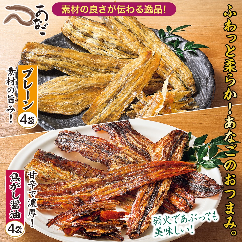 ●セット内容/<焦がし醤油>60g×4袋、<プレーン>60g×4袋 ●賞味期限/製造日から常温4ヵ月 ●加工地/日本 ●原材料/<焦がし醤油>(ベトナム産)、砂糖、食塩、味醂、醤油(大豆・小麦を含む)/ソルビトール、甘味料(キシロース)、調味料(アミノ酸等)、着色料(紅麹、カラメル)<プレーン>穴子(ベトナム産)、砂糖、食塩/ソルビトール、調味料(アミノ酸) ●特定原材料等 /<焦がし醤油>小麦・大豆、<プレーン>なし