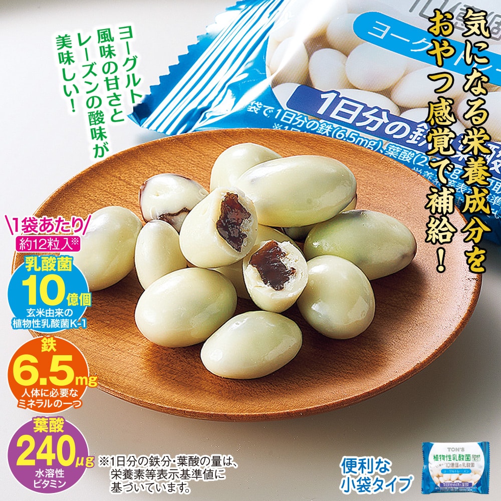 レーズンを植物性乳酸菌を含んだヨーグルト風味の生地でコーティング。さらに「鉄」と「葉酸」をプラスしました。 ヨーグルト風味の甘さとレーズンの酸味が美味しい! 便利な小袋タイプ。 1袋あたり 約12粒入※ ・乳酸菌10億個 玄米由来の植物性乳酸菌K-1 ・鉄6.5mg 人体に必要なミネラルの一つ ・葉酸240μg 水溶性ビタミン ※1日分の鉄分・葉酸の量は、栄養素等表示基準値に基づいています。