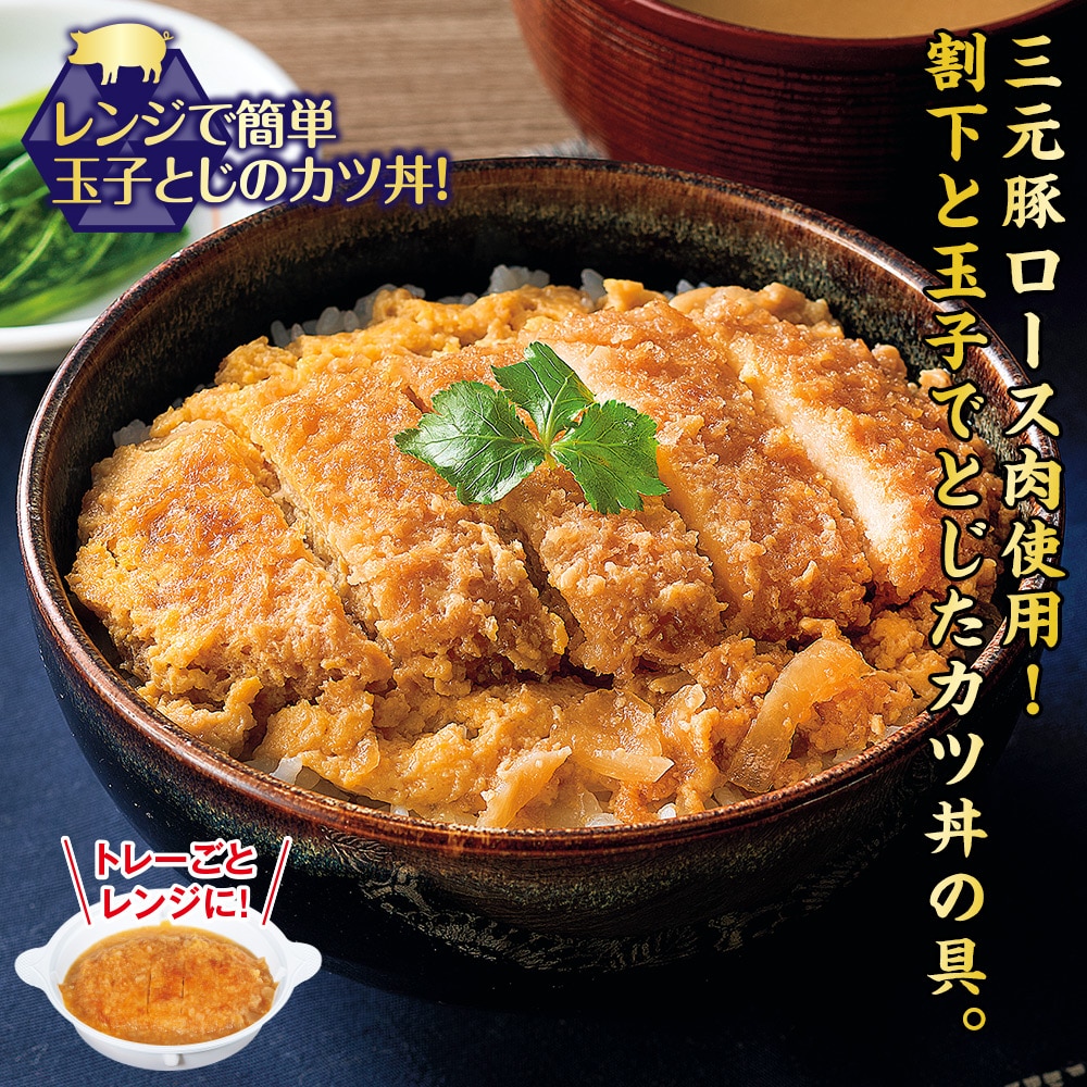 レンジで簡単玉子とじのカツ丼! 三元豚のロース肉に衣をつけてサクッと揚げ、鰹だしの効いた割下と玉子でとじてカツ丼の具に。 レンジで温めてご飯にのせれば、おいしいロースカツ丼のできあがりです。 トレーごとレンジに!