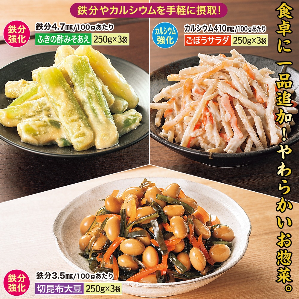 鉄分やカルシウムを手軽に摂取! 鉄分、カルシウムが豊富なお惣菜セットです。 塩分控えめで、やわらか仕上げなのでご年配の方にもおすすめです。 [ごぼうサラダ] カルシウム410mg/100gあたり [ふきの酢みそあえ] 鉄分4.7mg/100gあたり [切昆布大豆] 鉄分3.5mg/100gあたり