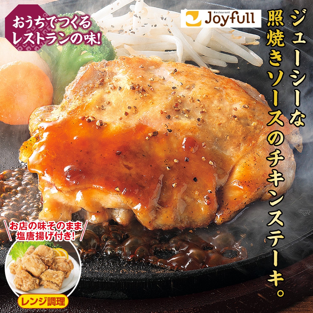 おうちでつくるレストランの味! 焼くと皮はパリッとお肉はジューシー。 照焼きソースでいただくジョイフル自慢のチキンステーキです。 お店の味そのまま塩唐揚げ付き!