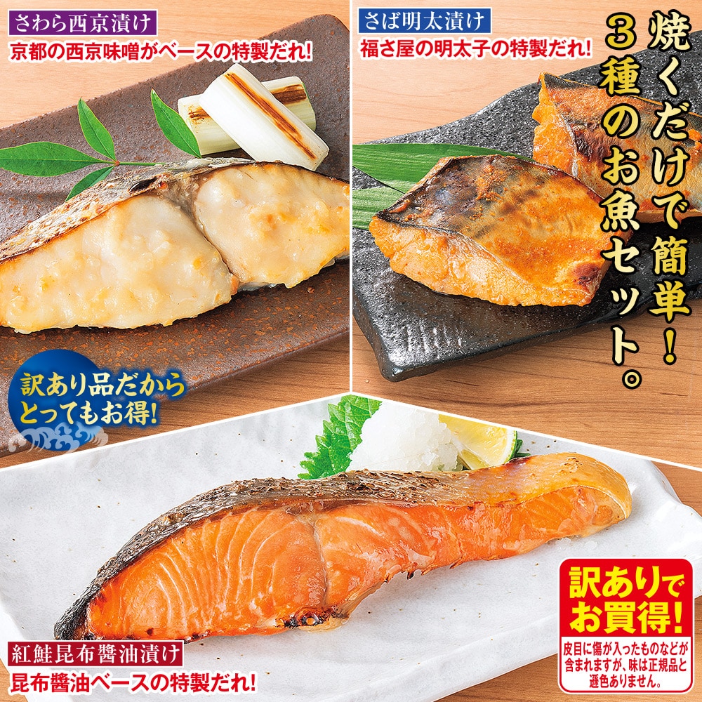 訳あり品だからとってもお得! 皮目に傷が入ったものなどが含まれますが、味は正規品と遜色ありません。 3種のお魚を3種の味付けでお届けします。本格的な漬け魚が楽しめるお得なセットです。 ・紅鮭昆布醬油漬け 昆布醬油ベースの特製だれ! ・さば明太漬け 福さ屋の明太子の特製だれ! ・さわら西京漬け 京都の西京味噌がベースの特製だれ!