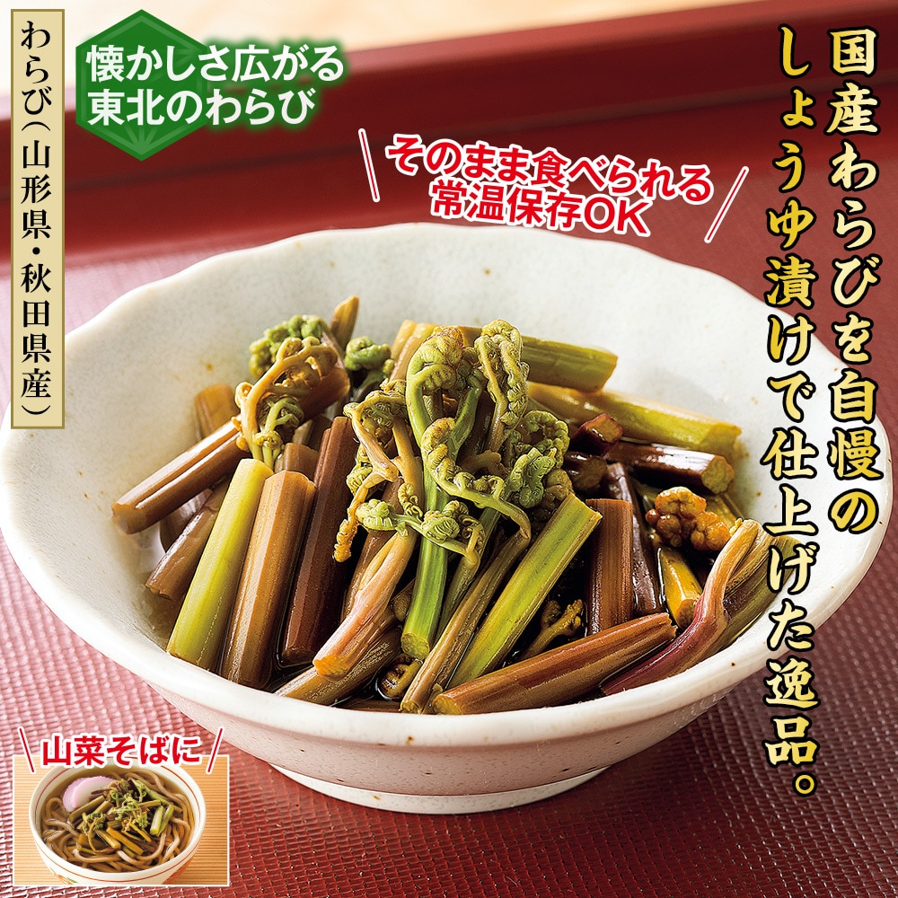 【わらび(山形県・秋田県産)】 懐かしさ広がる東北のわらび。 そのまま食べられる常温保存OK。 東北で採れるわらびをしょうゆ漬けにしました。 わらびのほのかな苦みと粘り気で歯ごたえがある柔らかい食感が楽しめます。