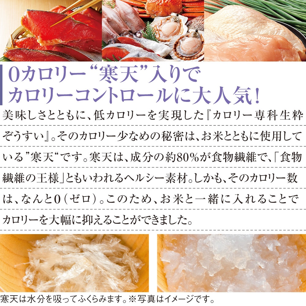 大好評カロリー専科生粋ぞうすいの大人気の6つの味! ●中華風ほたてぞうすい[98243] 明治時代から伝承される職人技で旨味を凝縮し、香味野菜を加えた鶏がらベースの中華だしで仕上げました。 (1袋:32kcal) ●京みそ鮭ぞうすい [93503] 上品な味わいの京みそと旨みたっぷり天然紅鮭を使って風味豊かに仕上げました。 (1袋:36kcal) ●参鶏湯風ぞうすい[108291] 韓国の代表的な鍋料理「サムゲタン」を和風テイストにアレンジ。 しっかりと鶏の旨味を感じられるスープに生姜の風味が絶妙にマッチした何度でも食べたくなる飽きのこない味わいに仕上げています。 (1袋:38kcal) ●たっぷり野菜のかにぞうすい [51177] ずわいがにとたっぷりの野菜を使って、やさしい味わいに仕上げました。 (1袋:34kcal) ●黄金コラーゲンふかひれぞうすい [53123] 高級感のある味わいとたっぷりのコラーゲン。プルプルと食感がよく、女性の方には特におすすめです。 (1袋:35kcal) ●贅沢海鮮ぞうすい [52135] 「鮭」「ほたて」「かに」「いか」4つの豪華な海の幸を一杯で楽しめます。 (1袋:32kcal) *★*――――――――*★* ◎1袋あたり38kcal以下 ◎食塩相当量1.2g以下 ○国内製造フリーズ食品