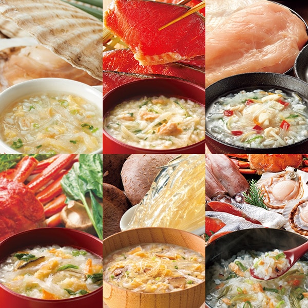 【セット内容】6種類(中華風ほたてぞうすい、京みそ鮭ぞうすい、参鶏湯風ぞうすい、たっぷり野菜のかにぞうすい、黄金コラーゲンふかひれ、贅沢海鮮ぞうすい)×各6食 【賞味期限】製造日から常温1年 ※個別商品の原材料・栄養成分値につきましては、商品パッケージをご確認の上、お召し上がりください。 【加工地】日本 【特定原材料】小麦・大豆・卵・ごま・牛肉・鶏肉・豚肉・ゼラチン・かに・えび・いか・乳成分 ◎国内製造 フリーズドライ食品