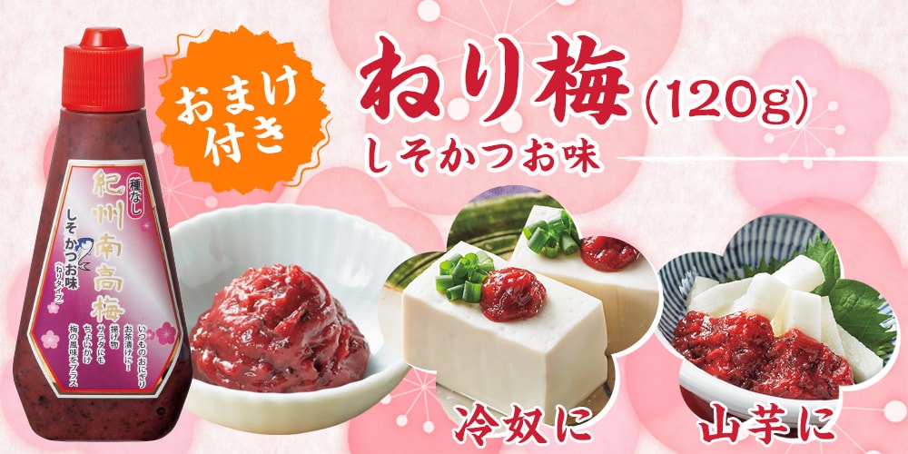 肉厚で果肉たっぷりの紀州南高梅を100%使用しました。 2L~4Lサイズを原料に使用。味つけは一級品と遜色ありません。 塩分約10% 【ねり梅】 香り豊かな紀州南高梅を種なしのねり梅に。 薬味はもちろん、お料理の味付けにも使いやすいチューブタイプです。 冷奴に!山芋に!