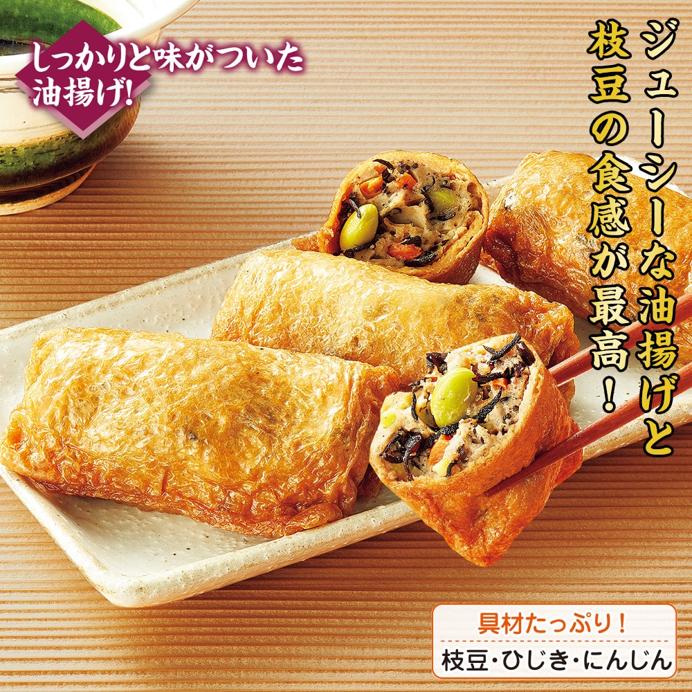 しっかりと味がついた油揚げ! 枝豆とひじきの入った生地を、だしの染み込んだ油揚げで丁寧に包みました。 電子レンジで温めるだけの簡単調理です。 具材たっぷり!枝豆・ひじき・にんじん。 1袋に4個入。