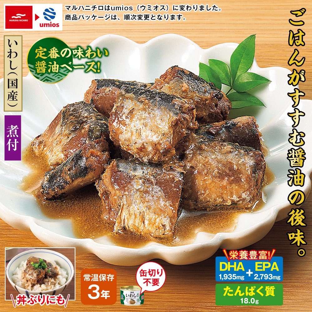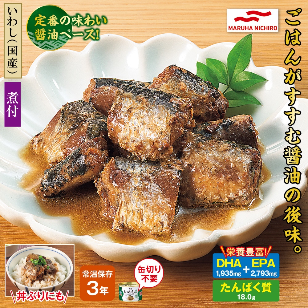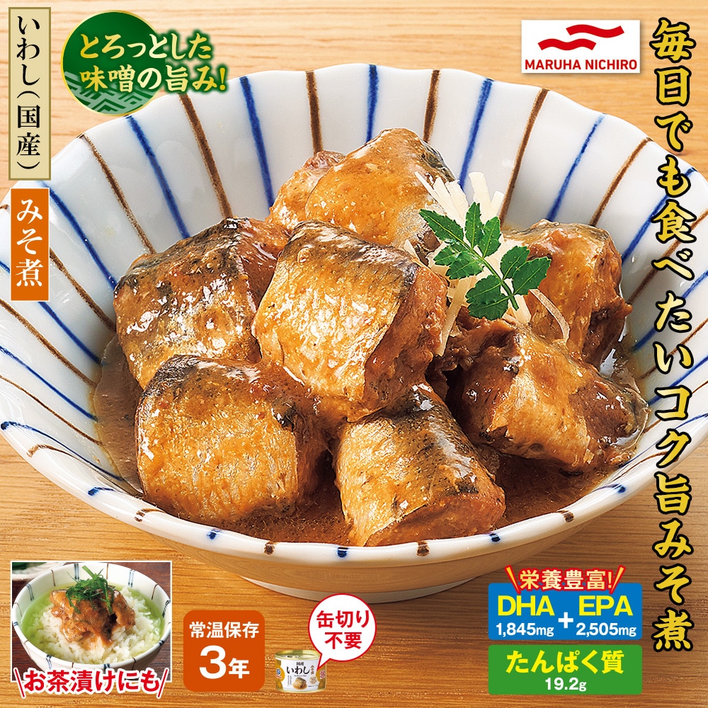【いわし(国産)】 <煮付> ごはんがすすむ醤油の後味。定番の味わい醤油ベース! DHA 1,935mg EPA2,793mg たんぱく質18.0g <みそ煮> 毎日でも食べたいコク旨みそ煮。とろっとした味噌の旨み! DHA 1,845mg EPA2,505mg たんぱく質19.2g 常温保存3年 缶切不要