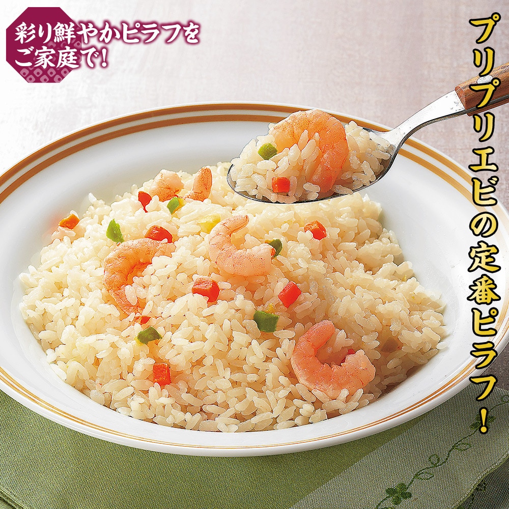 彩り鮮やかピラフをご家庭で! エビと玉ねぎ、人参、ピーマンを加えて仕上げた、風味豊かなピラフ。 レンジで温めるなどの簡単調理で、プロの味が楽しめる逸品です。