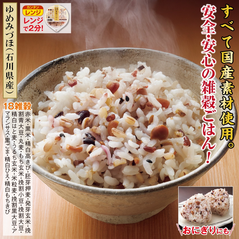 【ゆめみづほ(石川県産)】 すべて国産素材使用。安全・安心の雑穀ごはん!レンジで2分! 厳選した国産18雑穀にこだわって使用した、甘くて香ばしくて美味しい雑穀ごはん。栄養はもちろん、味や食感も大好評です。 18雑穀 赤米・黒米・精白高きび・胚芽押麦・発芽玄米・挽割青大豆・丸麦・もち玄米・挽割小豆・挽割大豆・精白はと麦・うるち玄米・米粒麦・挽割黒大豆・アマランサス・黒ごま・精白ひえ・精白もちきび