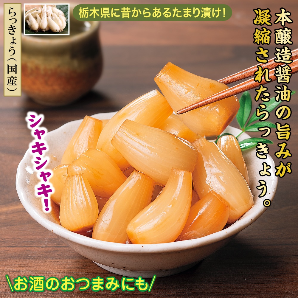 【らっきょう(国産)】 栃木県に昔からあるたまり漬け! お酒のおつまみにも。 国産の歯切れのよいらっきょうを約3ヵ月間乳酸発酵させ、昔ながらの製法でじっくりと漬け込みました。