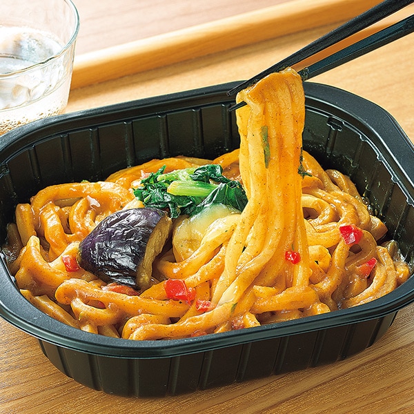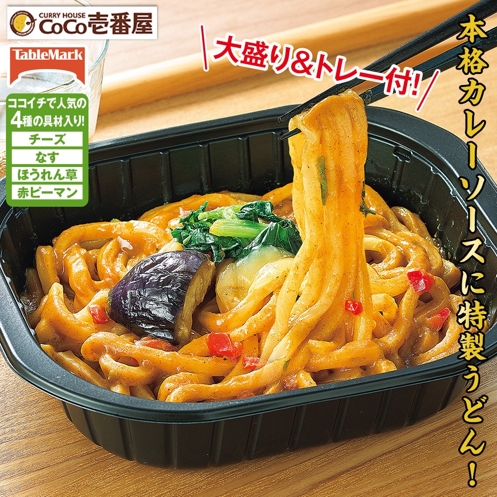 「CoCo壱番屋」監修の本格カレーソースと、汁なしカレーうどん用に改良した「テーブルマーク」のうどんが一つになりました。 大盛り&トレー付! ココイチで人気の4種の具材入り! ・チーズ・なす・ほうれん草・赤ピーマン