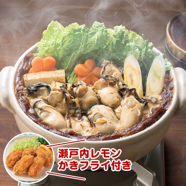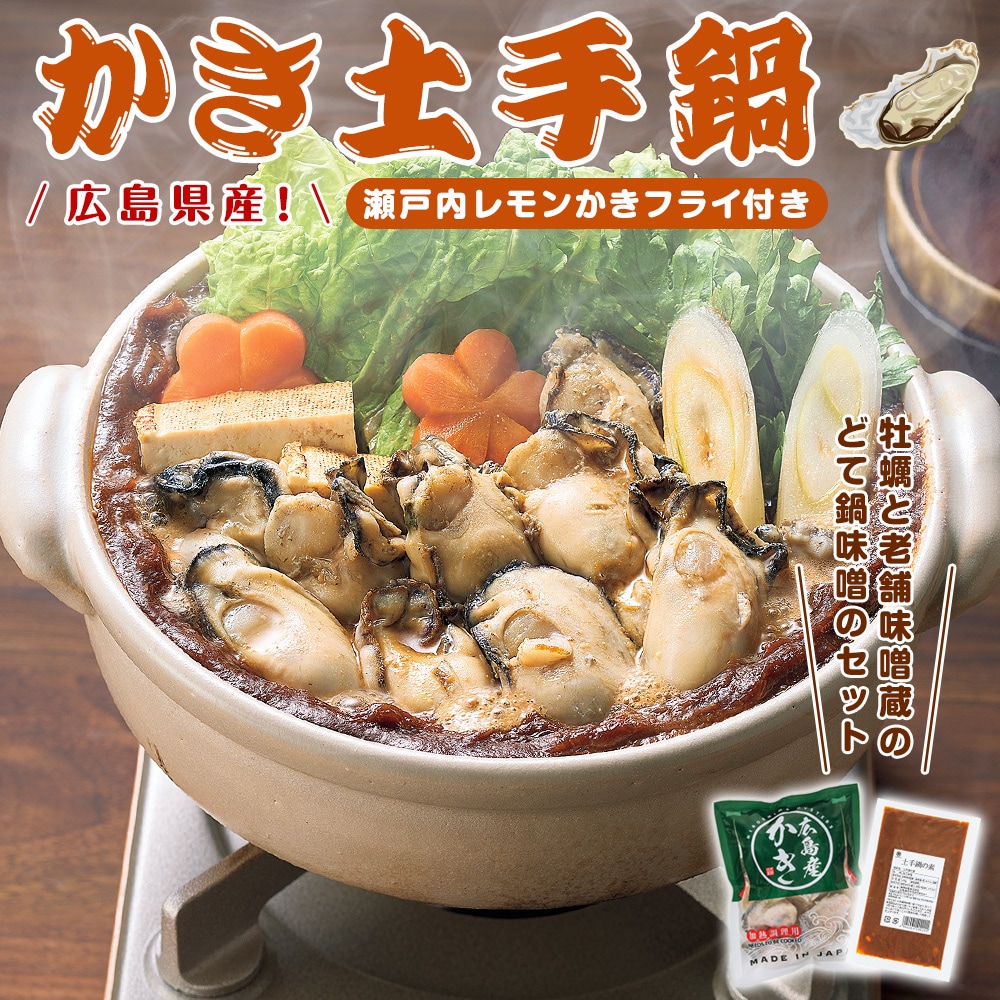 ●セット内容/冷凍かき300g(NET255g)×2袋、どて鍋用みそ300g(150g×2袋)、瀬戸内レモンかきフライ200g(25g×8粒) ●賞味期限/製造日から冷凍6ヵ月 ●加工地/日本 ●原材料/<冷凍かき>マガキ(広島県)<どて鍋用みそ>米味噌(国産)、麦味噌、酒、みりん/酒精<瀬戸内レモンかきフライ>カキ(広島産)、衣(パン粉、小麦粉、でん粉、コーングリッツ、植物油脂、砂糖、食塩、卵殻粉、レモン果汁、レモンピール粉末、乳糖)/加工でん粉、増粘多糖類、香料、ベーキングパウダー、調味料(核酸) ●特定原材料/<冷凍かき>なし<どて鍋用みそ>小麦・大豆<瀬戸内レモンかきフライ>小麦・卵・乳成分・大豆