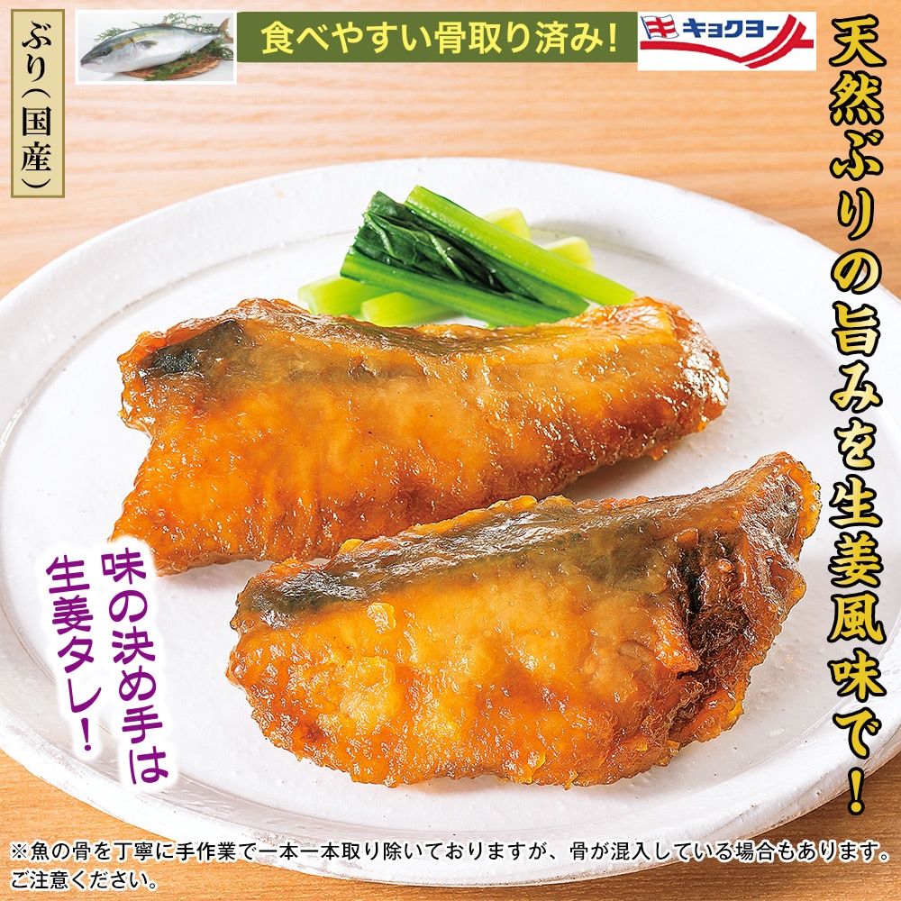 【ぶり(国産)】 食べやすい骨取り済み!味の決め手は生姜タレ! 国産の天然ぶりを丁寧に骨取りし、生姜のきいたタレでしっかりと味をつけました。