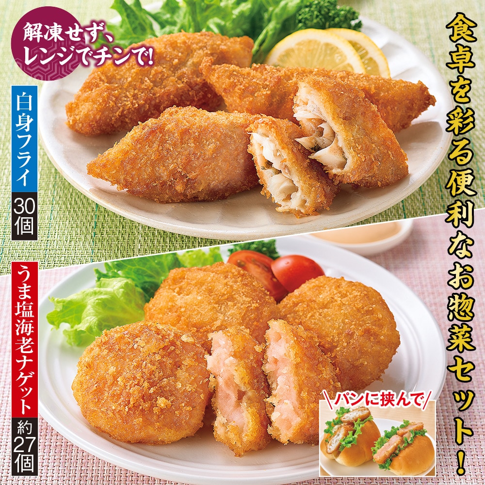 解凍せず、レンジでチンで! 簡単調理でいろんな食べ方もできる、白身フライと海老ナゲットの便利な2種セットです。 パンに挟んで。 うま塩海老ナゲット・白身フライ