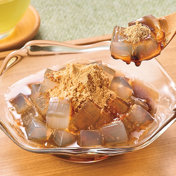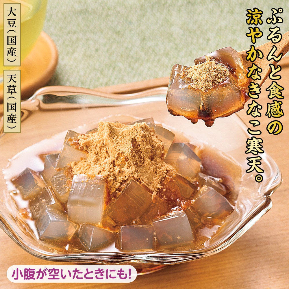【大豆(国産)】【天草(国産)】 厳選した国産の天草を使用した寒天と、国産の大豆を使用したきな粉で作り上げた涼し気なスイーツです。 小腹が空いたときにも!