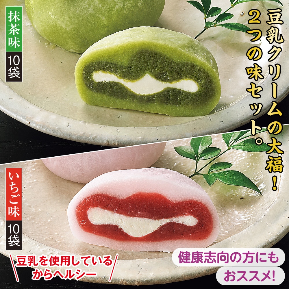●セット内容/<抹茶味>60g×10袋、<いちご味>60g×10袋 ●賞味期限/製造日から冷凍1年6ヵ月 ●加工地/日本 ●原材料/<抹茶味>砂糖(国内製造)、白いんげん豆、もち粉、上新粉、豆乳加工品(植物油脂、豆乳クリーム、砂糖類、その他)、還元水あめ、水あめ、抹茶/加工デンプン、乳化剤、pH調整剤、酵素、セルロース、塩化マグネシウム、着色料(青色1号)、カロチノイド色素、 (一部に大豆を含む)<いちご味>砂糖(国内製造)、白いんげん豆、もち粉、上新粉、豆乳加工品(植物油脂、豆乳クリーム、砂糖類、その他)、いちごピューレ(いちご、砂糖)、還元水あめ/加工デンプン、乳化剤、酸味料、pH調整剤、香料、酵素、着色料(ビートレッド、トマト色素)、セルロース、塩化マグネシウム、 (一部に大豆を含む) ●特定原材料等 /大豆