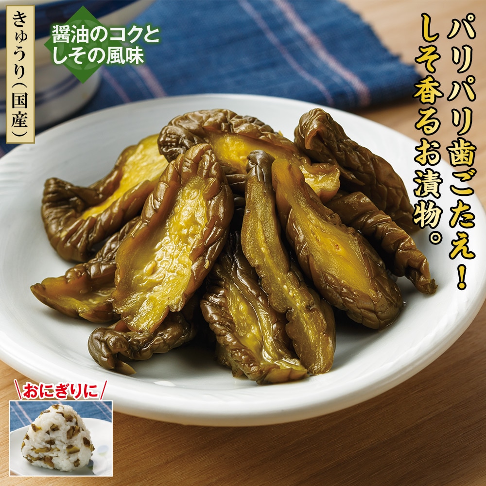 【きゅうり(国産)】 醤油のコクとしその風味。 塩漬けされたきゅうりを特製しょうゆで味付けしました。 しその風味が効いた食感の良いお漬物です。