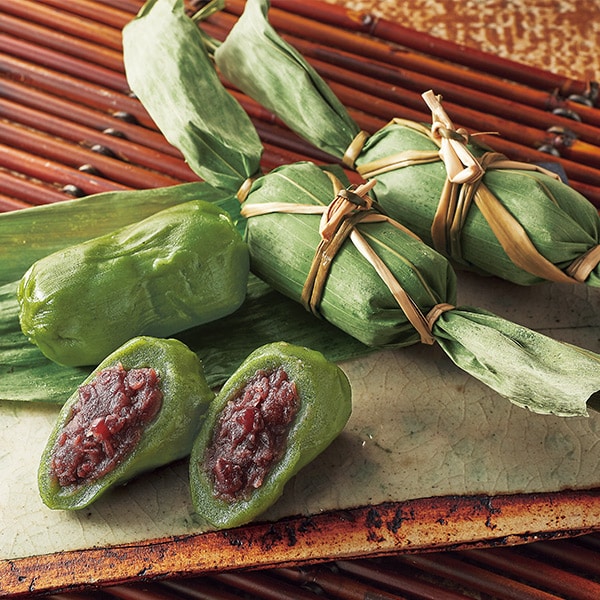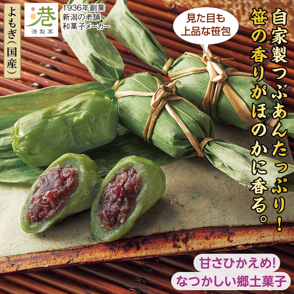 【よもぎ(国産)】 甘さひかえめ!なつかしい郷土菓子。 国産のよもぎを使った団子に自家製のつぶあんがぎっしり。 新潟県を代表する伝統和菓子。生笹で包まれた上品な見た目も人気の和菓子です。