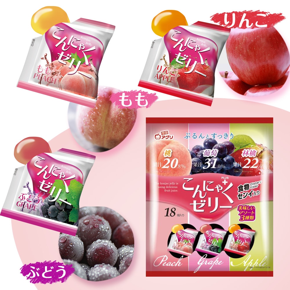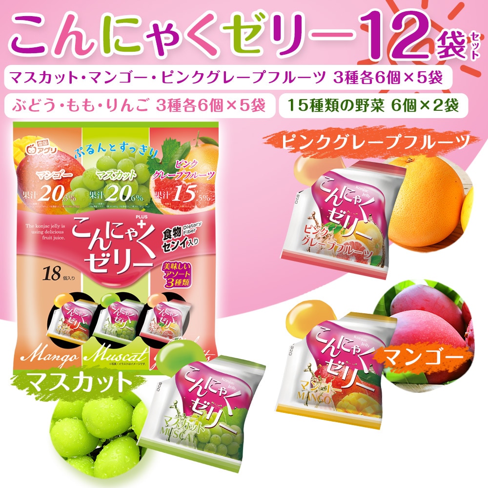 群馬県産の蒟蒻粉を100%使用(蒟蒻粉に占める割合) 食物繊維入り、3種のフルーツ蒟蒻ゼリー1袋に18個入り(3種各6個入り)を2種類を各5袋。 さらに15種野菜入ゼリー2袋のセット。 3種入(もも、ぶどう、りんご)×5袋 3種入(マンゴー、マスカット、ピンクグレープフルーツ)×5袋 15種の野菜(15個入)×2袋