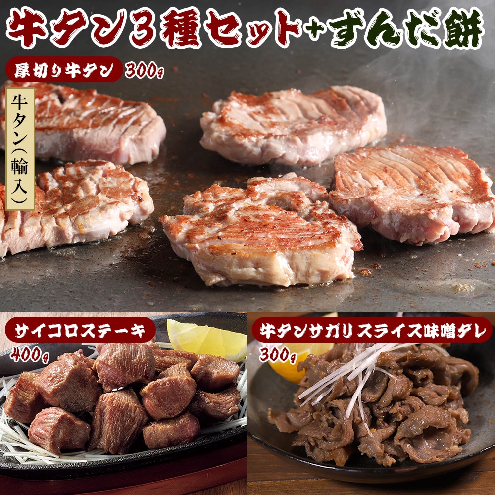 ●セット内容/<厚切り牛タン>300g<牛タンサガリ味噌漬け>300g<牛タンサイコロステーキ>400g<ずんだ餅>200g(5個) ●賞味期限/冷凍2026年9月16日 ●加工地/日本 ●原材料/<厚切り牛タン>牛内臓肉(ヨーロッパ産、南米産、ニュージーランド産、オーストラリア産、アメリカ産又はカナダ産)、食塩、ソルビット、pH調整剤、調味料(アミノ酸)、酸化防止剤(ビタミンE)<牛タンサガリ味噌漬け>牛たん下(メキシコ産)、たれ(みそ、砂糖、しょうゆ、発酵調味料、ぶどう発酵調味液、酒精、ごま油、香辛料、たん白自己消化物)、おろしにんにく、ごま油、食塩/調味料(アミノ酸等)、pH調整剤、増粘多糖類、酵素、」ビタミンB1、着色料(カロチノイド)<牛タンサイコロステーキ>牛肉(ヨーロッパ産、ニュージーランド産、オーストラリア産、南米産、アメリカ産又はカナダ産)/調味料(アミノ酸等)、pH調整剤、リン酸塩(Na)<ずんだ餅>ずんだあん(枝豆(だだちゃ豆12%)、砂糖、生餡、水あめ、寒天、食塩)(国内製造)、もち粉、砂糖/甘味料(トレハロース)、加工澱粉、ソルビトール、グリシン、着色料(クチナシ)、酵素、グリセリンエステル ●特定原材料等 /<厚切り牛タン>牛肉<牛タンサガリ味噌漬け>小麦・牛肉・ごま・大豆<牛タンサイコロステーキ>牛肉<ずんだ餅>大豆