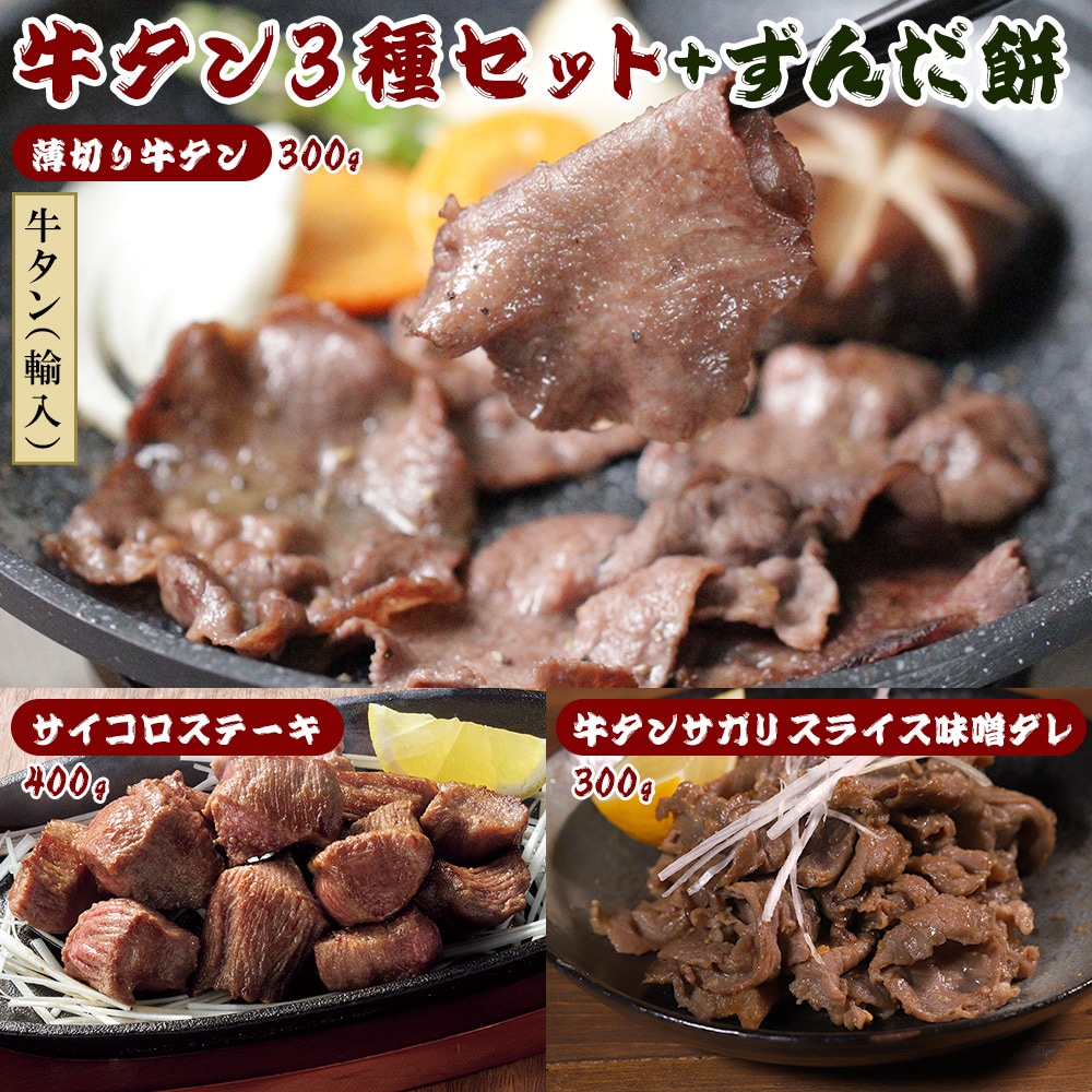 ●セット内容/<薄切り牛タン>300g<牛タンサガリ味噌漬け>300g<牛タンサイコロステーキ>400g<ずんだ餅>200g(5個) ●賞味期限/冷凍2026年9月16日 ●加工地/日本 ●原材料/<薄切り牛タン>牛内臓肉(ヨーロッパ産、南米産、ニュージーランド産、オーストラリア産、アメリカ産又はカナダ産)、食塩、ソルビット、pH調整剤、調味料(アミノ酸)、酸化防止剤(ビタミンE)<牛タンサガリ味噌漬け>牛たん下(メキシコ産)、たれ(みそ、砂糖、しょうゆ、発酵調味料、ぶどう発酵調味液、酒精、ごま油、香辛料、たん白自己消化物)、おろしにんにく、ごま油、食塩/調味料(アミノ酸等)、pH調整剤、増粘多糖類、酵素、」ビタミンB1、着色料(カロチノイド)<牛タンサイコロステーキ>牛肉(ヨーロッパ産、ニュージーランド産、オーストラリア産、南米産、アメリカ産又はカナダ産)/調味料(アミノ酸等)、pH調整剤、リン酸塩(Na)<ずんだ餅>ずんだあん(枝豆(だだちゃ豆12%)、砂糖、生餡、水あめ、寒天、食塩)(国内製造)、もち粉、砂糖/甘味料(トレハロース)、加工澱粉、ソルビトール、グリシン、着色料(クチナシ)、酵素、グリセリンエステル ●特定原材料等 /<薄切り牛タン>牛肉<牛タンサガリ味噌漬け>小麦・牛肉・ごま・大豆<牛タンサイコロステーキ>牛肉<ずんだ餅>大豆
