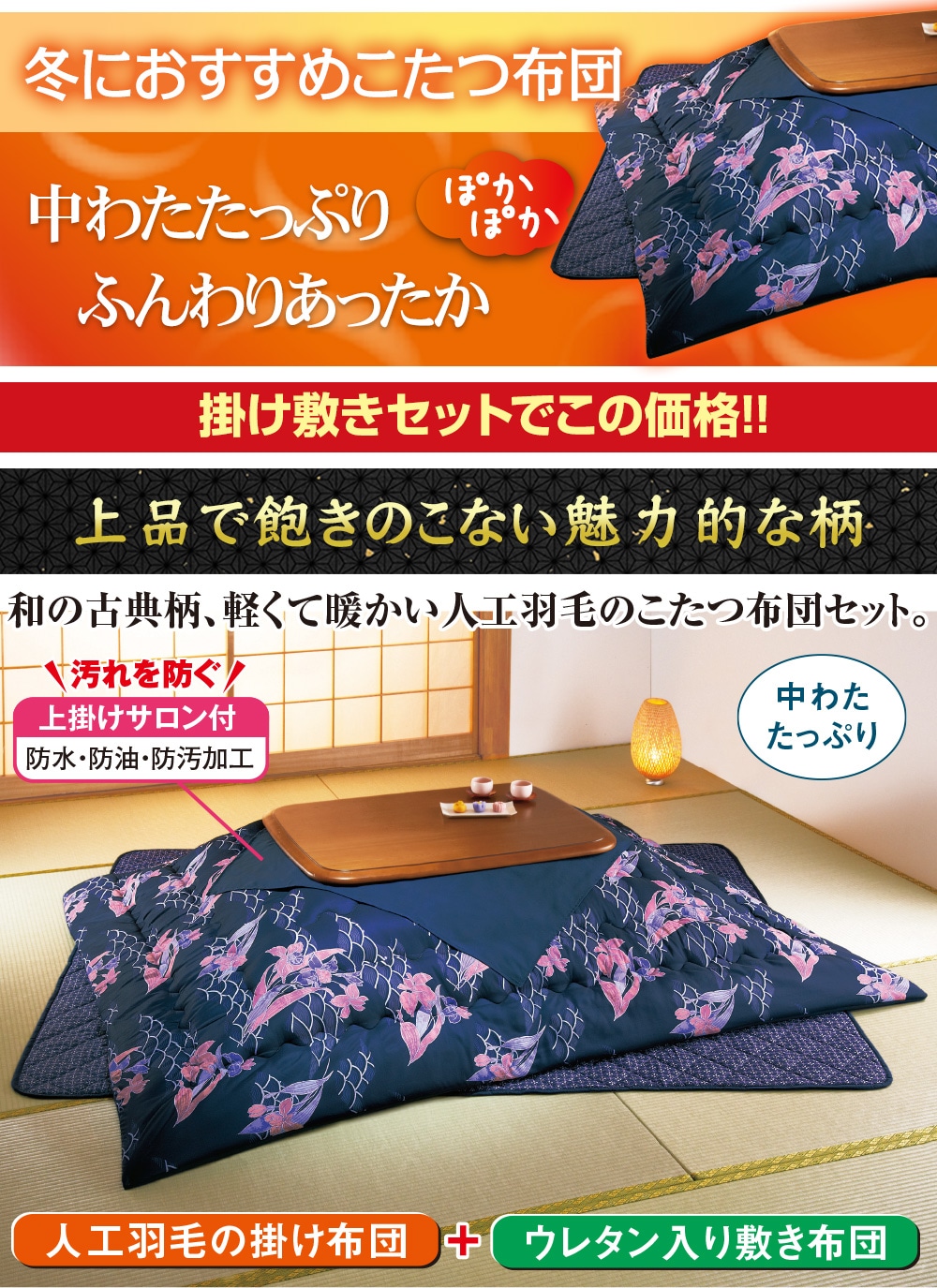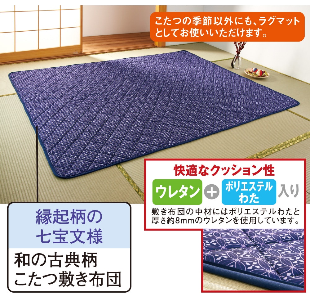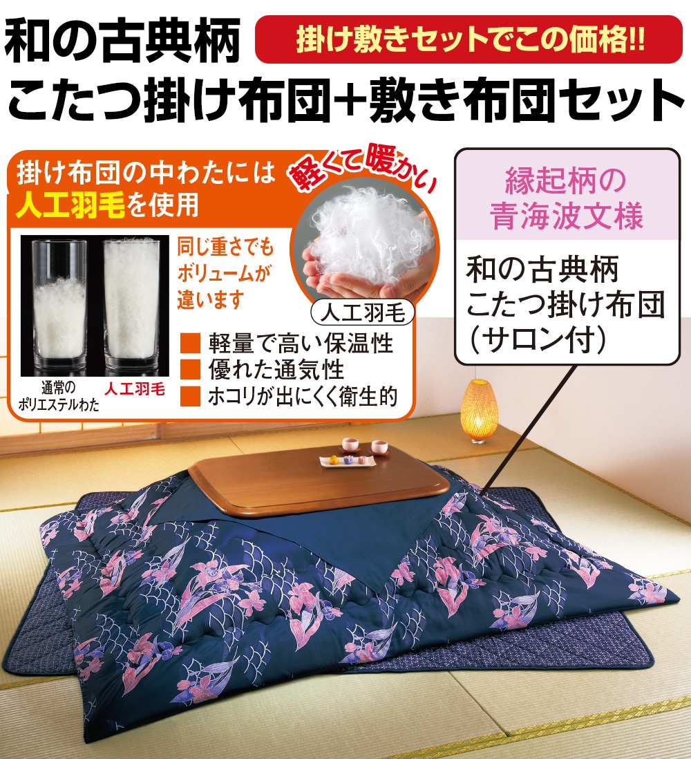 ≪和の古典柄、軽くて暖かい人工羽毛のこたつ布団!≫ ・軽量であったか人工羽毛の掛け布団 ・汚れを防ぐ上掛けサロン付/防水・防油・防汚加工 【はぴねすくらぶ企画商品】青海波と菖蒲の斬新デザイン/無限に広がる波を象った縁起の良い青海波(せいがいは)文様に、勝ち運を呼ぶ菖蒲を合わせ、斬新でモダンなデザインに仕上げました。/テキスタイルデザイナー TOMOKO.O 【縁起柄の青海波文様】 中わたたっぷり 【掛け布団の中わたには人工羽毛を使用】軽くて暖かい人工羽毛 同じ重さでもボリュームが違います ■軽量で高い保温性■優れた通気性■ホコリが出にくく衛生的 ≪ウレタン入りの七宝文様ラグ!≫ 【快適なクッション性】 ウレタン+ポリエステルわた入り 敷き布団の中材にはポリエステルわたと厚さ約8mmのウレタンを使用しています。 【はぴねすくらぶ企画商品】 縁起の良い七宝文様/世界中の財宝を象徴する七宝文様。無限に連鎖する輪から、家庭円満や子孫繁栄を表す吉祥文様としても親しまれています。/テキスタイルデザイナー TOMOKO.O 【縁起柄の七宝文様】 こたつの季節以外にも、ラグマットとしてお使いいただけます。