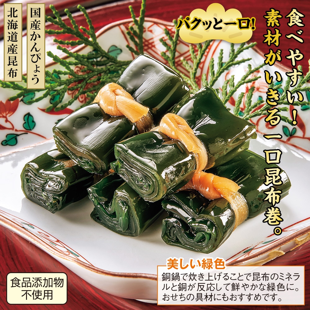 【北海道産 昆布】【国産 かんぴょう】 国産の昆布とかんぴょうを使った一口サイズの上品な昆布巻。 素材の味をいかす、砂糖、醤油、みりんのみのシンプルな味付けです。 美しい緑色 銅鍋で炊き上げることで昆布のミネラルと銅が反応して鮮やかな緑色に。 おせちの具材にもおすすめです。
