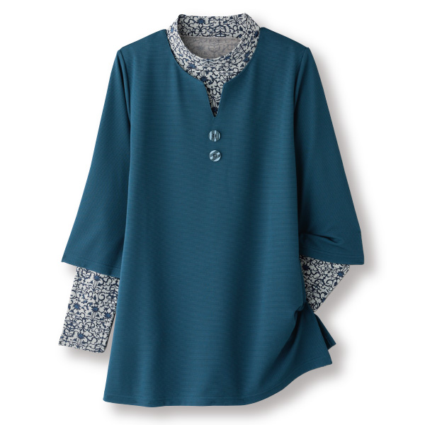 七分袖のチュニックにお洒落なアラベスク柄のプルオーバーを合わせたお買得アンサンブル。