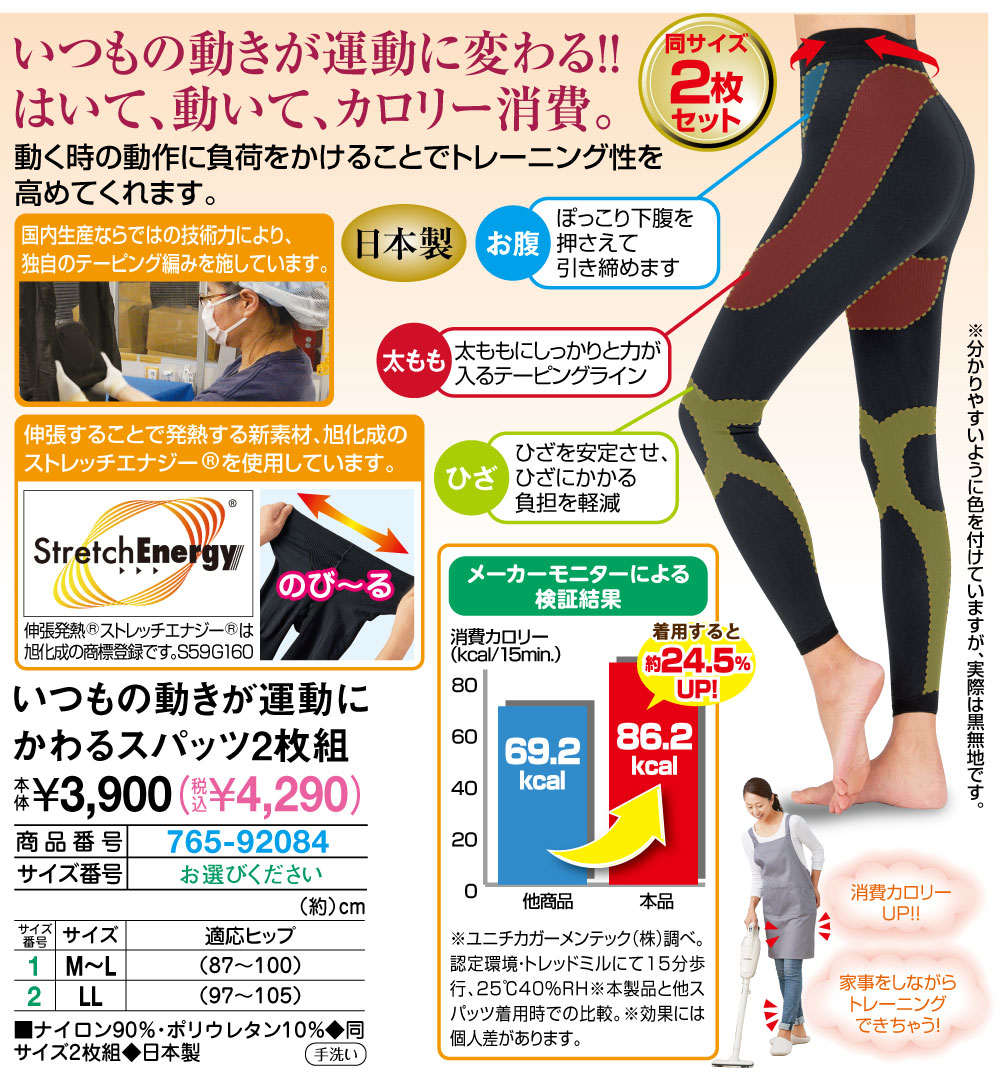 いつもの動きが運動に変わる!はいて、動いて、カロリー消費! 動く時の動作に負荷をかけることでトレーニング性を高めてくれます。 国内生産ならではの技術力により、独自のテーピング編みを施しています。 伸張することで発熱する新素材、旭化成のストレッチエナジー(R)を使用しています。 伸張発熱(R)ストレッチエナジー(R)は旭化成の商標登録です。 ◆商標登録番号:S59G160 【お腹】 ぽっこり下腹を押さえて引き締めます 【太もも】 太ももにしっかりと力が入るテーピングライン 【ひざ】 ひざを安定させ、ひざにかかる負担を軽減 【メーカーモニターによる検証結果】 他商品:69.2kcal 本品:86.2kcal 着用すると約24.5%UP! 消費カロリーUP! 家事をしながらトレーニングできちゃう! ●同サイズ2枚セット