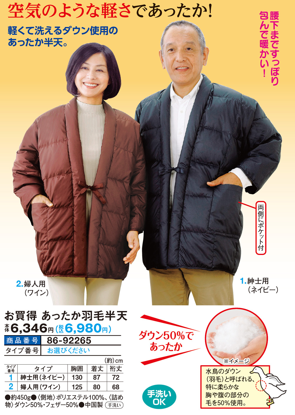 空気のような軽さであったか! 軽くて洗えるダウン使用のあったか半天。 腰下まですっぽり包んで暖かい! 両側にポケット付 \ダウン50%であったか/ 水鳥のダウン(羽毛)と呼ばれる、特に柔らかな胸や腹の部分の 毛を50%使用。