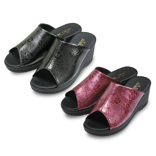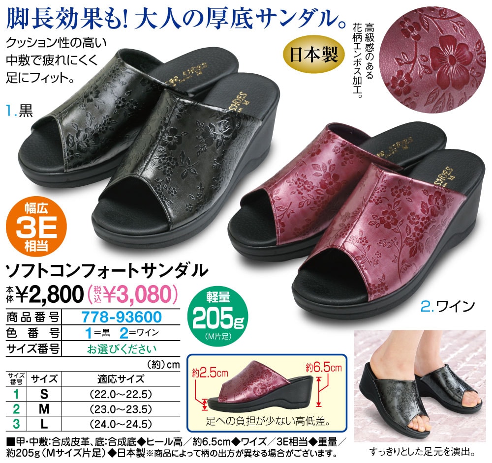 脚長効果も!大人の厚底サンダル! クッション性の高い中敷で疲れにくく足にフィット。 高級感のある花柄エンボス加工。 足への負担が少ない高低差。 ●幅広3E相当 ●軽量205g(M片足)