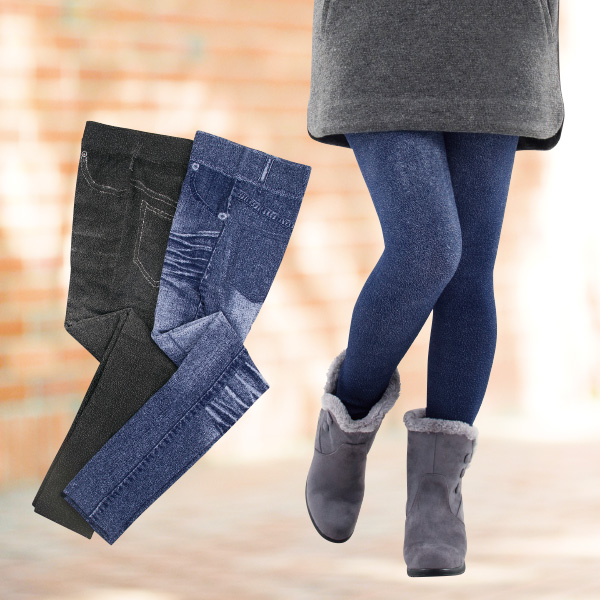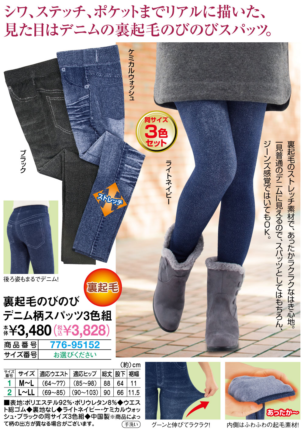 シワ、ステッチ、ポケットまでリアルに描いた、見た目はデニムの裏起毛のびのびスパッツ! 裏起毛のストレッチ素材で、あったかラクラクなはき心地。 一見普通のデニムに見えるので、スパッツとしてはもちろん、 ジーンズ感覚ではいてもOK。 グーンと伸びてラクラク! 内側はふわふわの起毛素材! ●裏起毛 ●ストレッチ ●同サイズ3色セット
