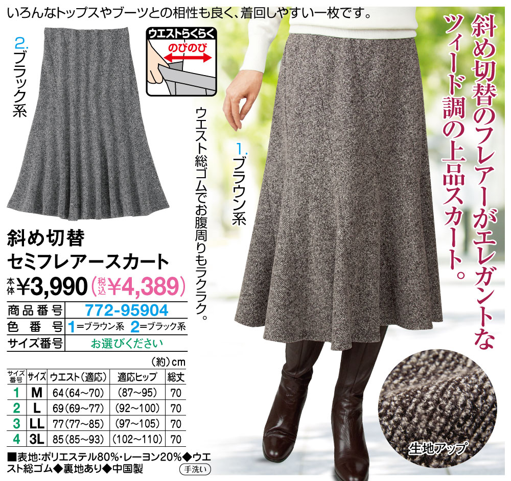 【サイズ(約)】 ウエスト(適応)、適応ヒップ、総丈 <M>64(64~70)cm、(87~95)cm、70cm <L>69(69~77)cm、(92~100)cm、70cm <LL>77(77~85)cm、(97~105)cm、70cm <3L>85(85~93)cm、(102~110)cm、70cm ■表地:ポリエステル80%・レーヨン20% ◆ウエスト総ゴム ◆裏地あり ◆中国製