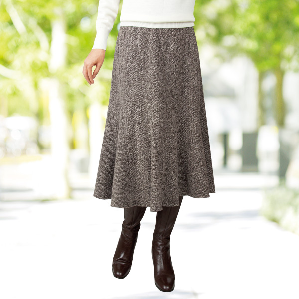 斜め切替のフレアーがエレガントな、ツィード調の上品スカート! いろんなトップスやブーツとの相性も良く、着回しやすい一枚です。 ウエスト総ゴムでお腹周りもラクラク。 【ウエストらくらく】 のびのび