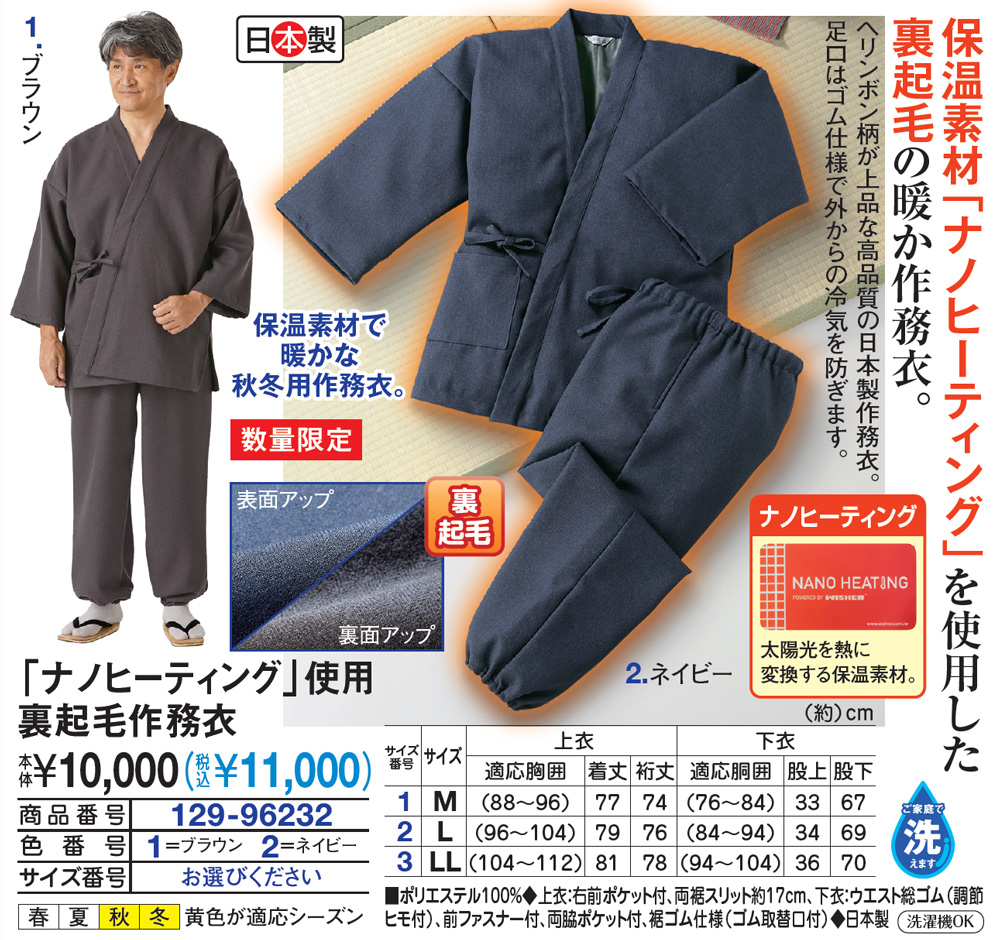 保温素材「ナノヒーティング」を使用した裏起毛の暖か作務衣!