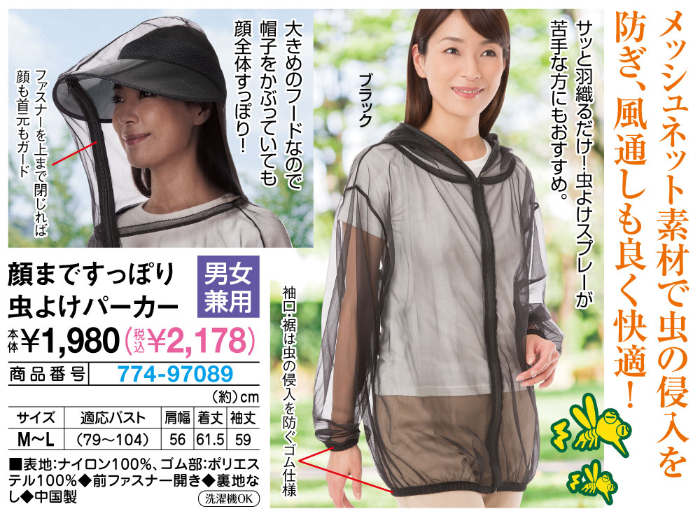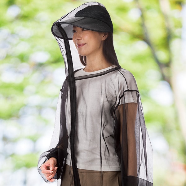 メッシュネット素材で虫の侵入を防ぎ、風通しも良く快適! サッと羽織るだけ!虫よけスプレーが苦手な方にもおすすめ。 大きめのフードなので帽子をかぶっていても顔全体すっぽり! ファスナーを上まで閉じれば顔も首元もガード 袖・裾は虫の侵入を防ぐゴム仕様 ●男女兼用