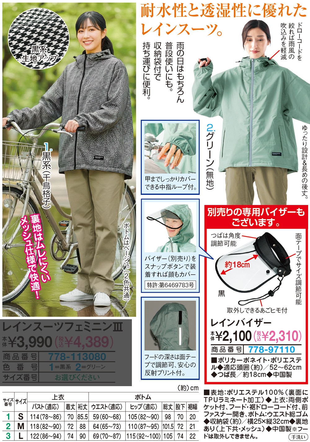 機能満載で嬉しいお洒落なレインコート専用バイザー! つばは角度調節可能 面テープでサイズ調節可能 取外しできるあごヒモ付