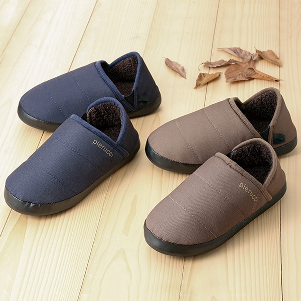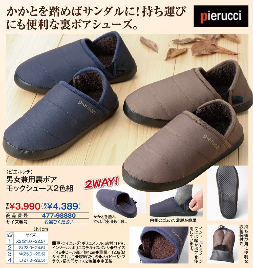 かかとを踏めばサンダルに!持ち運びにも便利な裏ボアシューズ かかとを踏んでのご使用も可能。 内側のゴムで、着脱が簡単。 持ち運び用に便利な収納袋付き。 インソールとライニングには暖かボアを使用しています。