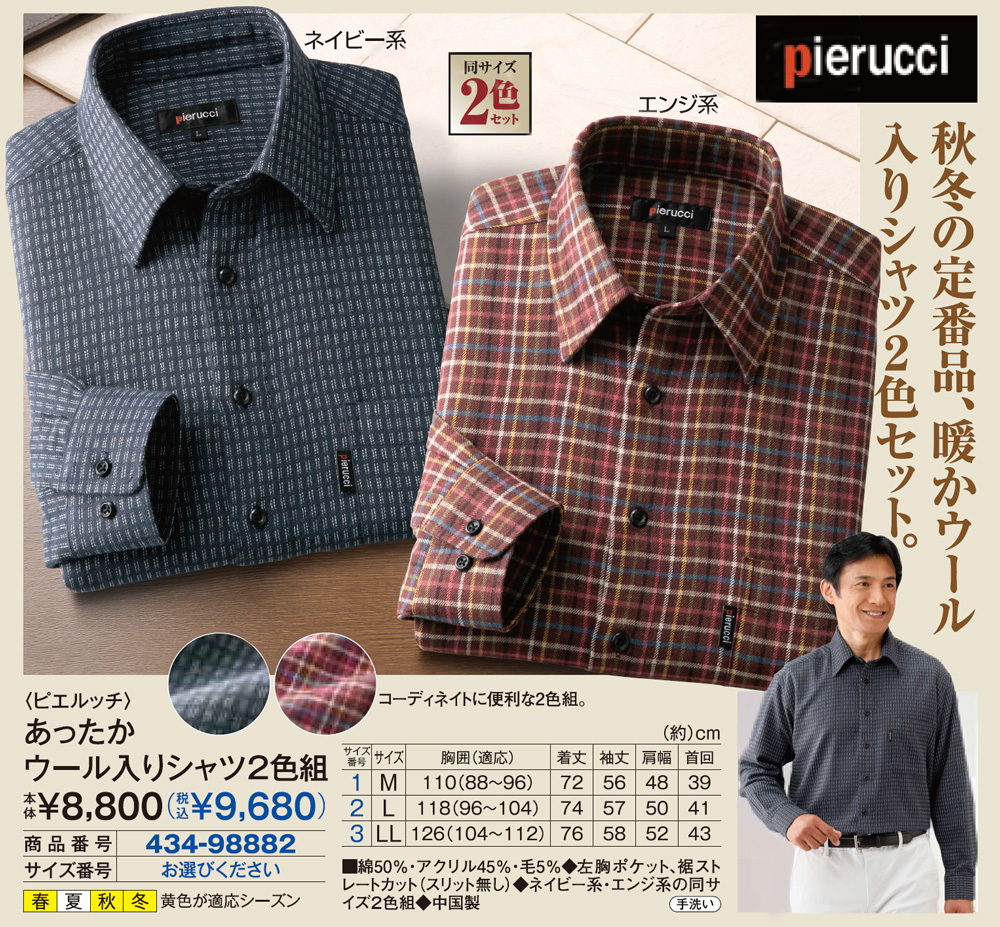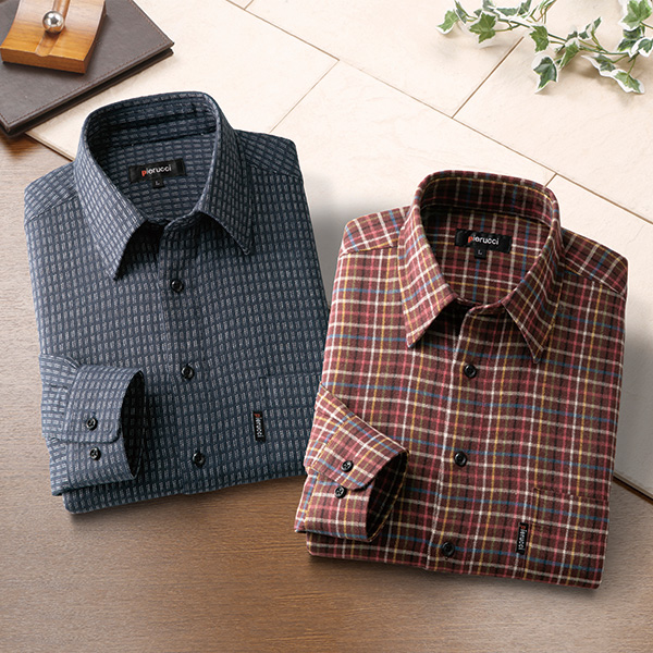 秋冬の定番品、暖かウール入りシャツ2色セット。 コーディネイトに便利な2色組。