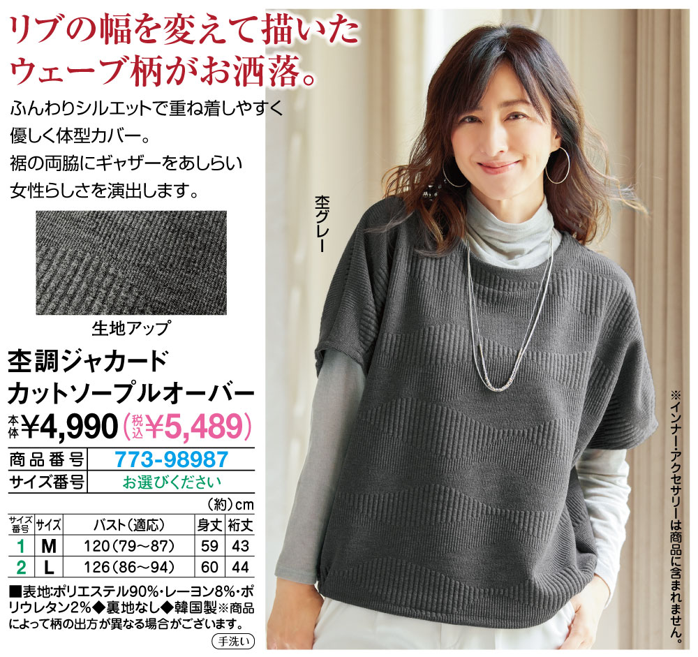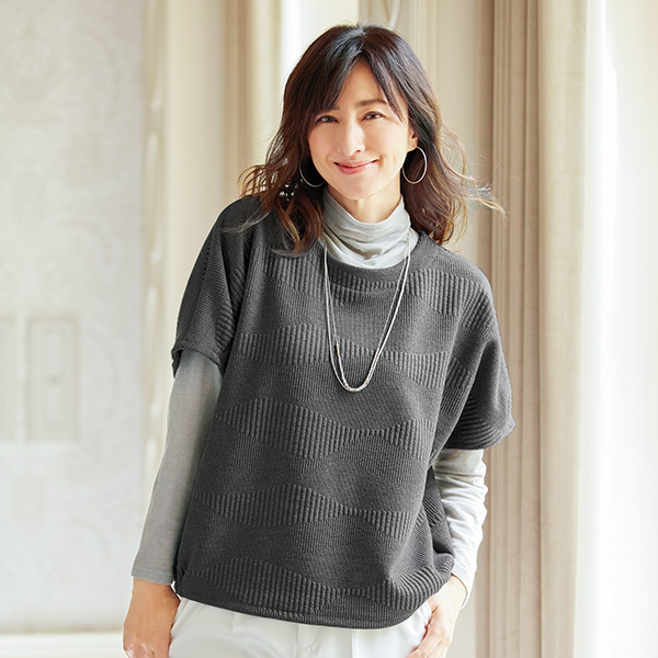 リブの幅を変えて描いたウェーブ柄がお洒落! ふんわりシルエットで重ね着しやすく優しく体型カバー。 裾の両脇にギャザーをあしらい女性らしさを演出します。
