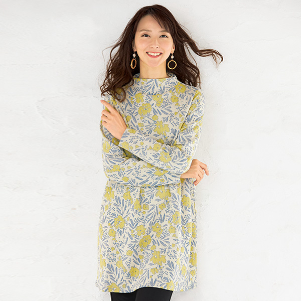 彩りも風合いも優しいAラインシルエットのチュニック! ジャカードカットソーのソフトな肌触りにふっくら凹凸感のある花々がフェミニン ウール入りで暖かく、体型をお洒落にカバーします ●綿混