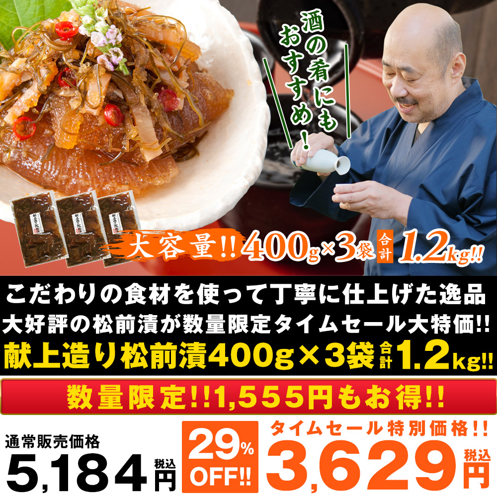 国産のするめいか、がごめ昆布白口浜真昆布に上質の数の子を贅沢に使用した味わい深い逸品。 慶長4年徳川家康より松前藩主に任命された豪族、蛎崎慶広に献上されたと言われる、北海道を代表する「松前漬」を現代風に再現しました。 当時は地元産の最高級昆布と厚切りのするめを醤油と昆布だし、かつおだしで味付けしていましたが、「献上造り松前漬」では食感の良い良質の数の子を加えじっくり熟成させる事で、献上造りの名にふさわしい、まろやかで風味豊かな「松前漬」に仕上げました。 大容量400g×3袋=1.2kg!