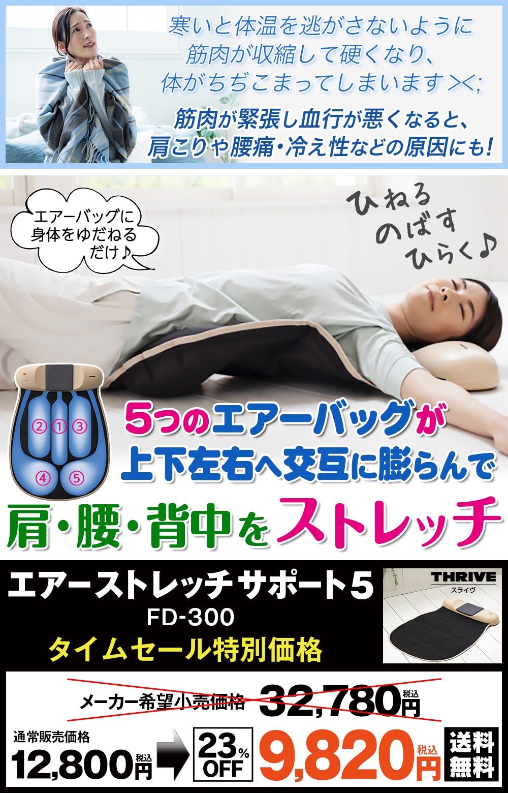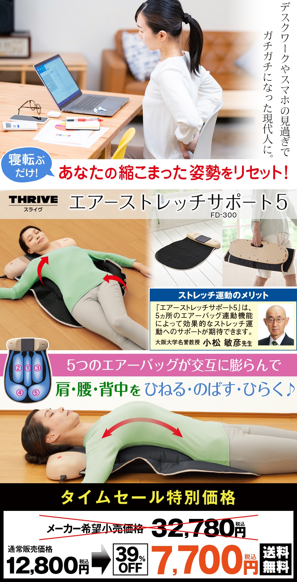 寝るだけ簡単、手軽にお部屋で簡単ストレッチ! 5つのエアーバッグが背中と腰を押し上げ体を伸ばします <おすすめ!寝ながらストレッチ> ●脱力した状態でできる ●無理なく体を伸ばす ●簡単で続けやすい <3つのコースを搭載> 【体をひねるコース】対角線上にエアーバッグが膨らみ、体にひねりを加えるストレッチを行います。 【体をのばすコース】上下のエアーバッグが交互に膨らみ、体をタテに伸ばすストレッチを行います。 【センターポールコース】センターのエアーバッグを活かして胸を開くストレッチを行います。