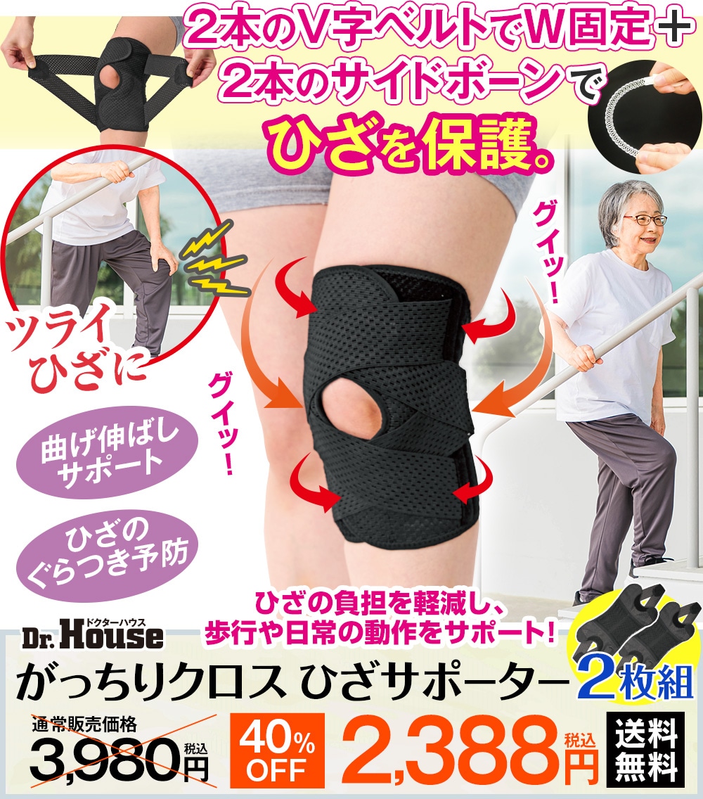 W固定+サイドボーンでひざを保護! ツライひざの負担を軽減し、歩行や日常の動作をサポートします。 【V型ベルト2段階の固定】2本のV字ベルトでひざ周りをしっかり固定 【負荷パッド】ひざのお皿の下に負荷パッドを設置し、関節にかかる負荷を軽減 【コイルボーン】両サイドに計4本のボーンを内蔵。ひざ裏は通気性の良いメッシュ 【スムーズな曲げ伸ばし!】 弾力性のあるコイルボーンがバネのように動き、ひざの曲げ伸ばしをラクに。 ●曲げ伸ばしサポート ●ひざのぐらつき予防 ●左右兼用 ●男女兼用