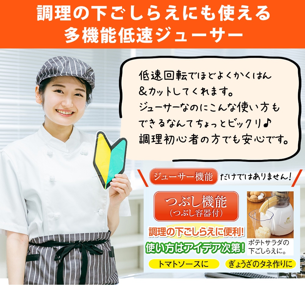 低速回転で野菜・果物の酵素・ビタミン・ミネラルを丸ごと補給! 酵素や各種ビタミン、ミネラルを壊さず、丸ごと摂れる「低速ジューサー」です。 <お好みの材料で簡単に作れます!> ・トマトジュース・にんじんジュース・リンゴ&レモンジュース・ほうれん草ジュース(水分の少ない野菜もOK) 低速回転で切らずに「搾る」! カッター刃を使わず、毎分47回転の低速スクリューでじわじわ圧力をかけて搾りだす『低速回転方式』を採用。高速ジューサーのような摩擦や衝撃がほとんどないため、食材の酵素やビタミン、ミネラルなどを壊さず、丸ごと摂ることができます。 <ジューサー機能> 野菜不足の解消や、毎日のビタミン補給に! <つぶし機能> 使い方はアイデア次第!ジューサー容器をつぶし容器に交換して食材を投入するだけ。低速回転で程よくかくはん&カットし、調理をサポートします。 茹でたじゃがいもとゆでたまごを入れて、ポテトサラダの下ごしらえに。 ※本品はフードプロセッサーとは異なり、細かいみじん切りなどはできません。 <低速スクリュー>ゆっくりやさしく圧搾 <新鮮ジュース>味が濃くて美味しいジュースがたっぷり!! <残り具>残り具も料理などに利用して有効活用! ●ミックスジュースやアレンジメニューも! ●レシピブック付 ●音も静か! <お手入れ安全&ラクラク> 容器やスクリューは簡単に取外せ、付属の掃除用ブラシで水洗い。カッター刃がないから安全にお手入れできます。