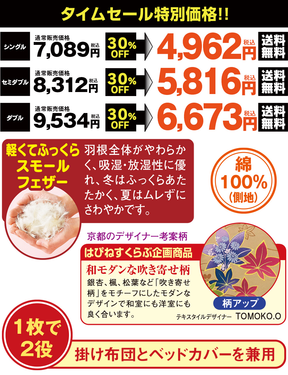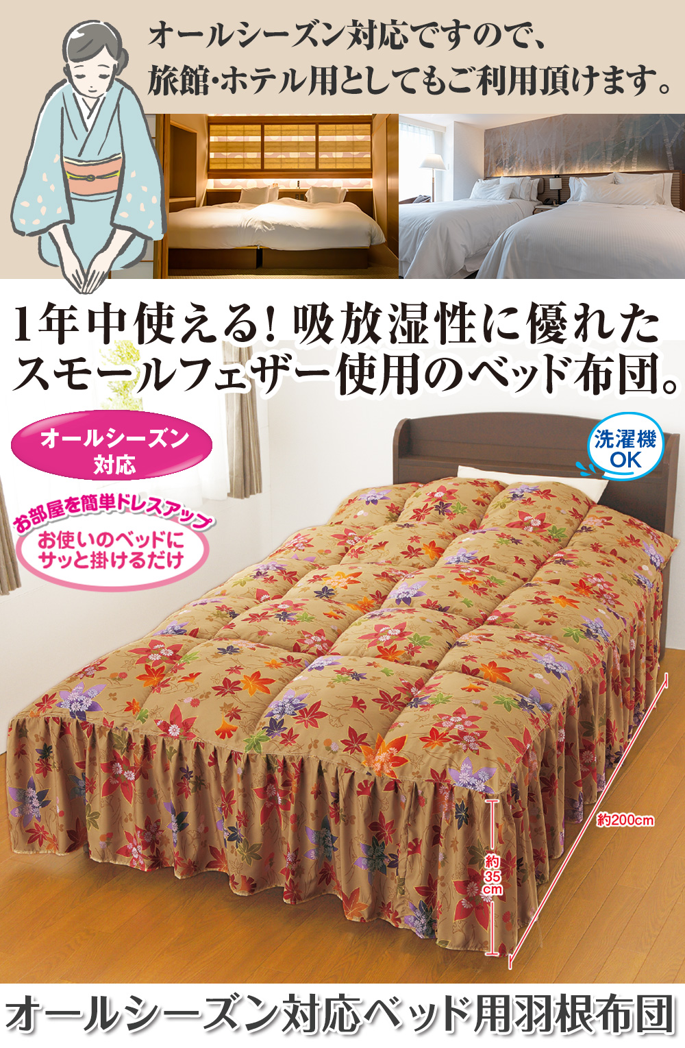 1年中使える!吸放湿性に優れたスモールフェザー使用のベッド布団! 掛け布団とベッドカバーを兼用 1枚で2役 通年使えるベッド布団 ●簡単 手間がかかるベッドメイクも…サッと掛けるだけ!! ●快適 寝返りしても背中が出ない! ●キレイ ベッド下の収納などをお洒落に目隠し! 【軽くてふっくらスモールフェザー】 羽根全体がやわらかく、吸湿・放湿性に優れ、夏はムレずにさわやかで、冬はふっくらあたたかです。 ●洗濯機OK ●オールシーズン対応 ●お部屋を簡単ドレスアップ お使いのベッドにサッと掛けるだけ 京都のデザイナー考案柄 【はぴねすくらぶ企画商品】 和モダンな吹き寄せ柄 銀杏、楓、松葉など「吹き寄せ柄」をモチーフにしたモダンなデザインで和室にも洋室にも良く合います。 テキスタイルデザイナー TOMOKO.O