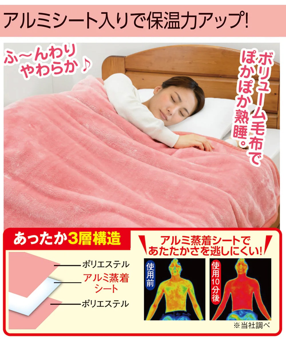 あたたかさ抜群の2枚合わせボリューム毛布! アルミシートで冷気を遮断、反射熱でぽかぽかあったか♪ お家で丸洗いできていつも清潔! ふ~んわりやわらか♪ アルミ蒸着シートであたたかさを逃しにくい!