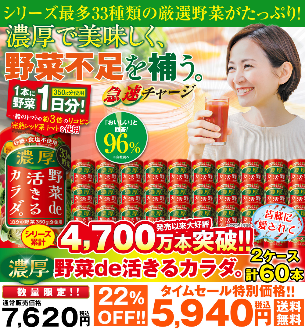 濃厚野菜de活きるカラダ。のこだわりポイント 【濃い!】 1本125gに約3倍の野菜350g分をギュッと凝縮 トロっと濃厚で、まるで果物ジュースのような味わい。 【33種類の野菜を使用】 栄養のバランスを考えて、果菜、葉菜、根菜をバランスよく厳選。 【ゴミ出し簡単、環境に優しいエコ容器を採用】 軽くて簡単に潰せるエコ容器(カート缶)を採用。 普段の食生活の栄養の偏りが気になる方に、1本プラスするだけで栄養バランスがぐっと整います! ★こんなときにおすすめ ・外食、コンビニ弁当を利用する機会の多い方 ・野菜を普段あまり食べない方、野菜が苦手な方 ・ダイエット中の方 ・生野菜の高騰時の代替品として